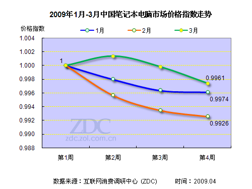 根據ZDC的價格監測數據顯示,2009年第一季度筆記本市場的價格降幅較小,三個月的價格指數均下降了不到1個百分點。1月份173款筆記本降價竟是“蜻蜓點水”,最終價格指數僅下降了0.39個百分點。這主要是由于隨著春節的臨近,多款產品出現缺貨現象:一方面是一些熱門產品本身暢銷、供不應求;另一方面是部分經銷商囤積居奇,希望狠賺一筆。
