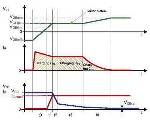 正如IG=f(t)圖所示,導(dǎo)通過程可以分為三個階段。分別是柵極-發(fā)射極電容的充電,柵極-集電極電容的充電和柵極-發(fā)射極電容的充電直至IGBT全飽和。柵極電流IG對輸入電容進行充電,IGBT的導(dǎo)通和關(guān)斷特性由與充電過程有關(guān)的電壓VGE和VCE來體現(xiàn)。在關(guān)斷期間,所描述的過程運行在相反的方向,電荷必須從柵極上移除。