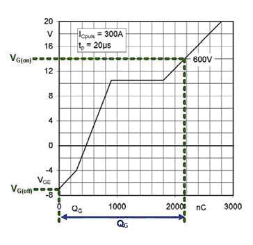 總的刪極-發(fā)射極電壓可通過考慮所施加的柵極導(dǎo)通電壓VG(on)和關(guān)斷電壓VG(off)之差來進行計算。圖3中來自IGBT數(shù)據(jù)表的圖表顯示了在正象限和負(fù)象限的柵極電荷曲線。如果柵極電荷曲線只在正象限給出,則柵極電荷的幅值可由外插法讀出。即使在沒有柵極電荷曲線的情況下,通過使用輸入電容Cies=CGE+CGC這一準(zhǔn)確度稍差的方法也能確定柵極電荷。