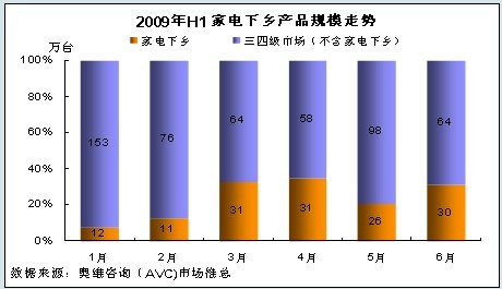 根據(jù)奧維咨詢(AVC)對(duì)家電下鄉(xiāng)市場的監(jiān)測以及對(duì)全國市場零售規(guī)模的評(píng)估,2009年1-6月份彩電下鄉(xiāng)零售規(guī)模為141.09萬臺(tái),占三四級(jí)市場的總量的21.54%。