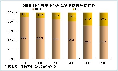 隨著LCD電視產(chǎn)品價(jià)格的不斷下降,在城市市場LCD電視對(duì)CRT電視的替代率在不斷增加,目前CRT電視在城市市場已經(jīng)處于一個(gè)補(bǔ)充的從屬地位,農(nóng)村市場已經(jīng)成為CRT產(chǎn)品銷售的主要市場。從彩電下鄉(xiāng)的銷售數(shù)據(jù)來看,2009年上半年CRT銷售占家電下鄉(xiāng)銷售總量的79.94%,仍占據(jù)彩電下鄉(xiāng)的主導(dǎo)地位;從銷售比重的走勢看,LCD正不斷侵蝕CRT的市場,其中尤以4、5月份侵蝕速度最快。