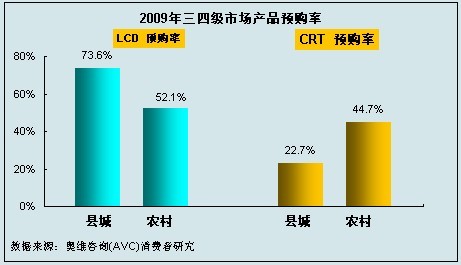 奧維咨詢(AVC)對(duì)主要下鄉(xiāng)省份的三四級(jí)市場研究結(jié)果顯示,在有計(jì)劃于2009年購買彩電產(chǎn)品的人群中,他們更傾向于購買LCD產(chǎn)品,;而即使在農(nóng)村市場,CRT產(chǎn)品的預(yù)購率仍要低于LCD產(chǎn)品,扣除消費(fèi)者購買能力因素,LCD在農(nóng)村市場的被接受程度仍然較高。