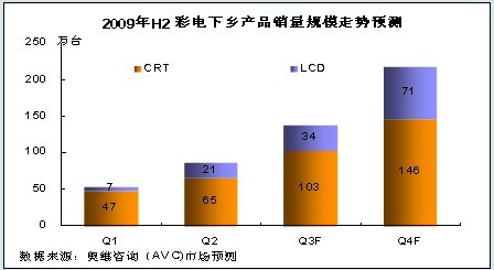 根據(jù)奧維咨詢(AVC)對(duì)三四級(jí)以及農(nóng)村市場的理解和研究,結(jié)合下半年彩電業(yè)形勢,我們認(rèn)為:隨著各省對(duì)家電下鄉(xiāng)工作的進(jìn)一步開展以及彩電市場傳統(tǒng)旺季的到來,2009年第三、四季度,彩電下鄉(xiāng)規(guī)模將繼續(xù)保持較快速度增長,同時(shí)LCD產(chǎn)品的比重也將進(jìn)一步增加,到第四季度,LCD產(chǎn)品銷量比重將占彩電下鄉(xiāng)市場的三分之一,銷售額比重將突破50%。