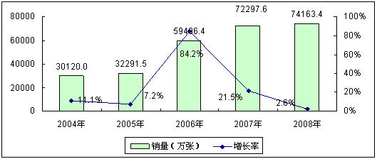 在中國移動用戶快速增長的直接帶動下,中國移動通信卡市場規模也迅速擴大,此外,基于用戶網間、網內換號以及SP業務的蓬勃發展也為中國移動通信卡市場的快速增長注入動力。2004年到2008年,中國移動通信卡市場銷量規模從3.0億張急劇增長到7.4億張,四年年均復合增長率達到25.3%,移動通信也成為中國智能卡應用的最大市場。