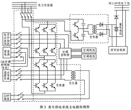 DC600V空調(diào)客車供電系統(tǒng)采用機(jī)車集中整流,客車分散逆變方式,構(gòu)成了整個(gè)列車的交一直一交變流供電系統(tǒng)。工作過(guò)程為:電力機(jī)車將25kV電網(wǎng)單相交流電降壓、整流、濾波成DC600V后給客車供電,客車根據(jù)用電設(shè)備的需要,將機(jī)車提供的DC600V變換成單、三相交流電及DC110V。系統(tǒng)采用兩套獨(dú)立供電。具有一定的冗余,客車供電的基本原理圖如圖3所示。
