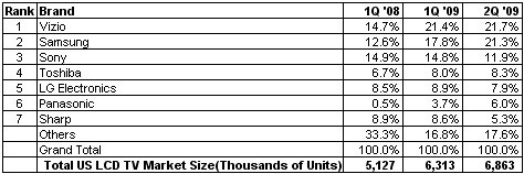 據iSuppli公司,雖然第二季度Vizio在美國液晶電視市場仍然保持龍頭地位,但位居其后的三星電子大幅縮小了與它的差距,因為買家青睞其LED背光電視。