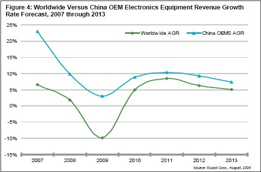圖4所示為iSuppli公司對2007年至2013年全球以及中國OEM電子設備營業(yè)收入增長率的預測。