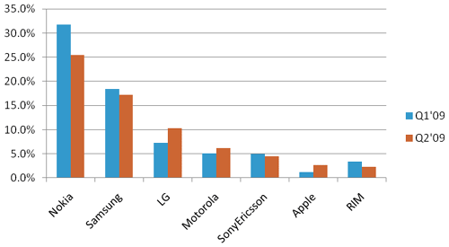 圖二 : 各主要手機品牌的出貨量市占率(2009年第一季與第二季比較)