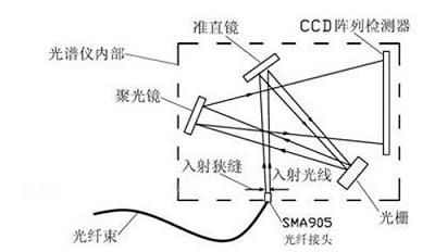 光譜儀微型化設計的實現得益于攝譜結構,最初的光學平臺采用對稱式Czerny-Turner分光結構[8],荷蘭Avantes公司生產的微小型光纖光譜儀即使用了這種光學平臺設計(圖1所示)。光信號由光纖傳導經過一個標準的SMA905接口進入光譜儀內部,經球面鏡準直,然后由一塊平面光柵分光后,將入射光分成按一定波長順序排列的單色光,再由聚焦鏡聚焦到一維線性CCD線性陣列探測器上進行檢測。