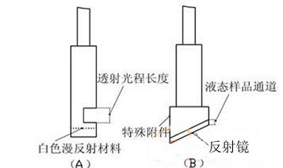 圖4-A是透射式浸入探頭,在探頭末端有一段1mm、2.5mm或5mm的缺口,光通過此物理間隙由底部的白色漫反射材料反射回連接到光譜儀的光纖,信號進入儀器內進行檢測。通過把探頭浸入或固定在液體中,可在線測量吸收率。圖4-B是工業用熒光探頭,它在反射式探頭末端加裝特殊的附件,變為一個45。角的前端視窗,該附件可有效防止周圍環境光進入探頭,并屏蔽激發光來增強熒光信號。被測液體光程還可在0-5mm之間調節。