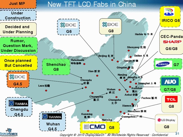 市場方面,隨著面板價格上揚、終端銷售成績比預期理想、中國家電下鄉及以舊換新政策的實施等,整個FPD產業景氣似乎已然復蘇,天馬、夏普、三星、LG等廠商陸續開始在大陸建立新生產線或重新啟動停產產能。