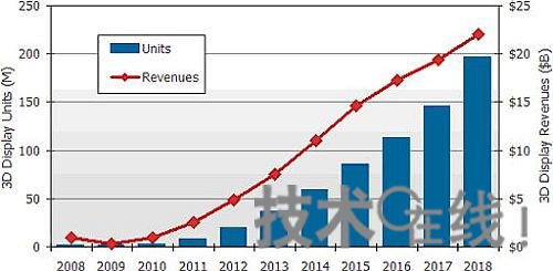 目前,3D(三維)顯示器非常引人注目。最新發布的《3D顯示器技術&市場調查報告》預測,3D顯示器市場的供貨量和供貨金額將從2008年的70萬臺、9億200萬美元增長至2018年的1億9600萬臺、220億美元(圖1)。如果市場果真按照該預測增長的話,年均復合增長率(CAGR)按金額計算將達到38%,按數量計算將達到75%。
