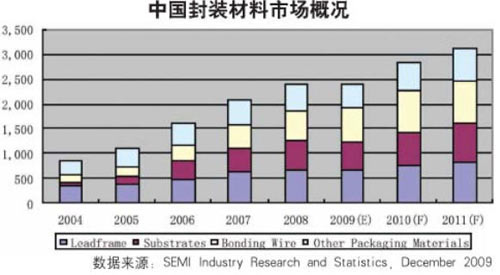 中國的半導體封裝材料市場在2009年將超過22億美元,比2008年增加1%左右。預計2011年達到31億美元。
