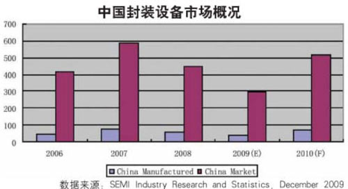 中國的封裝設備市場在2008年達到4.52億美元。受經濟危機影響,中國封裝設備市場在2009年預計下滑34%左右,為3億美元。隨著中國封裝設備市場的快速成長,部分領先的設備商在中國設立了生產線。然而本土封裝設備占中國市場份額不足15%且主要應用于低端市場。
