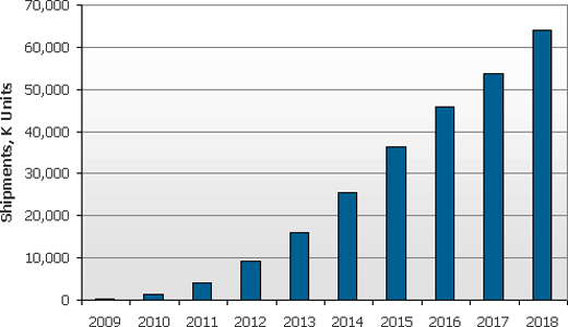 • 3D TV將由2009年的20萬臺成長到2018年的640萬臺