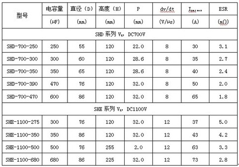 表1 EACO的SHD、SHE系列DC-Link單面金屬化聚丙烯薄膜電容器部分數據