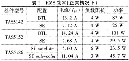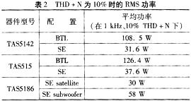 TexasInstruments還提供具有數字增益控制功能的RMS功率測量方式,使THD+N≤10%。利用TI公司的TAS5508或TAS5086型調制器,可以實現數字增益。THD+N為10%時的平均功率要高于正常FTC的THD+N<1%時的額定功率。表2列出了THD+N為10%時的平均功率。