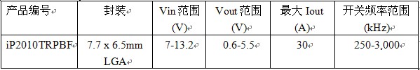 iP2010的輸入電壓范圍為7V至13.2V,輸出電壓范圍則為0.6V至5.5V,輸出電流高達30A。這個器件最高運行頻率為3MHz。在5MHz運行時,與iP2010引腳兼容的iP2011備有相同的輸入和輸出電壓范圍,但后者經過優(yōu)化,從而使最高輸出電流高達20A。通過以通用占位面積提供多種電流額定值器件,IR提供的靈活性能夠滿足不同客戶對電流水平、性能和成本的要求。