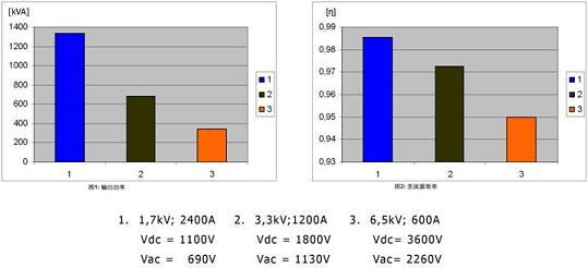結(jié)果顯示,采用3.3kV、1200A獨立模塊得到的最大功率約為采用1.7kV、2400AIGBT所得功率的一半。相比之下,6.5kV、600AIGBT模塊所提供的功率僅為1.7kVIGBT的四分之一。產(chǎn)生這一結(jié)果的原因是IGBT模塊的損耗。如果計算圖2中三個變換器的效率,可以看到損耗比為1:2:4。