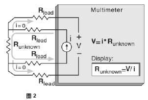 沒有電流流過電壓敏感線。 數字萬用表用所測電壓值除以已知電流,從而得到未知電阻值。