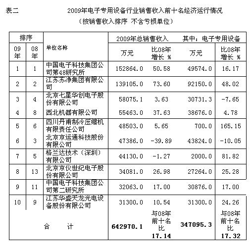 2009年電子專用設備行業前十名銷售收入總額達到64.3億元,占全行業銷售收入的69.9(2006年為61% 2007年為63.9% 2008年為66.5%),比2008年的前十名銷售收入增長17.14%。入圍前十名的銷售收入也從2008年的2.82億元提高到2009年的3.13億元。中國電子科技集團公司第四十八研究所,2009年在太陽能設備和太陽能電池片的推動下得到了快速的發展,總銷售收入達到15.3億元,繼續位居行業的首位。