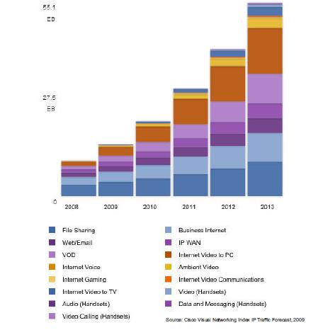 如圖1所示,從2007年到2012年,IP總流量將增加6倍,幾乎每兩年就翻倍。2012年之前,流量每年增長522exabytes(1018,即zettabyte的一半)。這種指數(shù)增長的主要推動(dòng)力量是高清晰視頻和高速寬帶消費(fèi)類應(yīng)用。