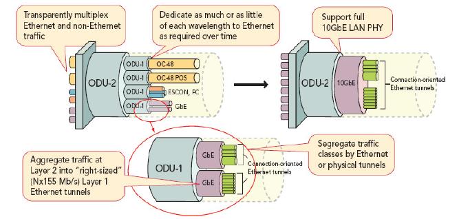 OTN含有的網(wǎng)絡(luò)功能和協(xié)議要求能夠滿足這些需求,以系統(tǒng)方式在光介質(zhì)上傳輸信息。本文重點(diǎn)介紹通過光纖承載傳送網(wǎng)和以太網(wǎng)載荷。建立同步數(shù)字體系(SDH)等OTN機(jī)制也在這一定義范圍之內(nèi),但是我們主要關(guān)注LAN到WAN的應(yīng)用,特別是40GbE和100GbE應(yīng)用(802.3ba)。出于這一標(biāo)準(zhǔn)化以及工作規(guī)劃的目的,所有OTN新功能以及相關(guān)技術(shù)都被認(rèn)為是電信標(biāo)準(zhǔn)局(ITU-T標(biāo)準(zhǔn))的工作范疇。