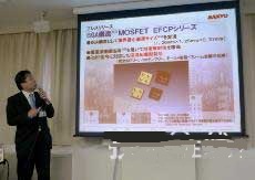 面向新聞媒體的發布會。三洋半導體的吉村充弘(高端器件事業部小型器件開發部課長)介紹了此次的產品。攝影:Tech-On!。投影顯示的是三洋半導體的數據。上部的大尺寸封裝為EFC4615R,下部的小尺寸封裝為EFC4612