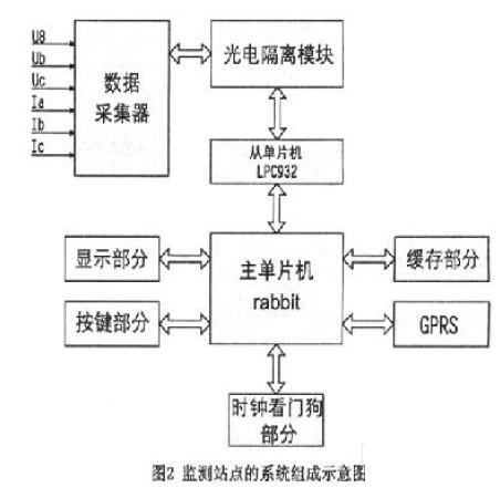 監(jiān)測站點(diǎn)由前端數(shù)據(jù)采集器和現(xiàn)場下位機(jī)構(gòu)成,其中前端數(shù)據(jù)采集器采用CS5460模塊和LPC932單片機(jī)構(gòu)成,它負(fù)責(zé)采集監(jiān)控現(xiàn)場的各項(xiàng)數(shù)據(jù)并存儲。線路的內(nèi)部經(jīng)過嚴(yán)格的電磁隔離,測量電路經(jīng)過采樣、A/D轉(zhuǎn)換處理后形成的數(shù)字信號再經(jīng)過光電耦合由信號適配器向從單片機(jī)LPC932傳送,主單片機(jī)與從單片機(jī)之間可采用I/O口模擬時(shí)序的方式進(jìn)行串口通信。
