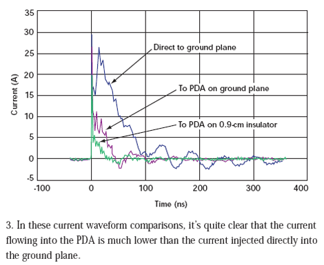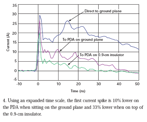 但是,我們見到的電流減小前后并不一致。當PDA直接放在接地板上時,初始電流尖峰降低了10%。當PDA放在0.9cm絕緣層上時,初始電流尖峰減低33%(圖4)。在20ns點,直接放在接地板上的PDA受到的沖擊要小69%,而位于絕緣層上的PDA受到的沖擊要小93%。電流減少是在沖擊狀態下給PDA充電的結果。在每次沖擊測試過程結束后,我們必須將PDA接地使它回到未充電狀態才能進行下次測量。