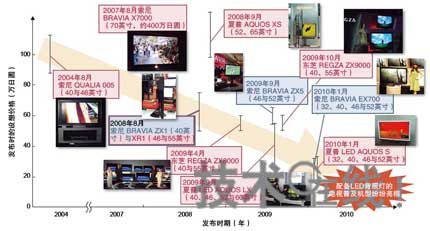 我們把目光移向最新機種上配備的LED背照燈,可以看出面向普及價格開發的方向性。2010年1月發布的索尼的BRAVIA EX700與夏普的LED AQUOS S兩機種都是很好的例子。對LED等的改善使得40英寸機種的設想價格可以下降到大約17~18萬日元。