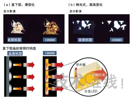 圖2 薄型機種也有區域亮度控制 索尼分別發布了直下型薄型化的LED背照燈電視(a),和可控制區域亮度的側光式LED背照燈的LCD TV(b)。均采用白色LED光源。(據索尼的資料制作)