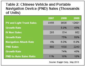 表2所示為iSuppli公司對2007-2009年中國市場PND銷量以及汽車銷量的估計。