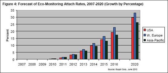 上述每類應(yīng)用的汽車配售率預(yù)計(jì)都會增長,2010-2013年增長比較緩慢,隨后從2014年開始基本以兩位數(shù)的速度增長,直到2020年末。iSuppli公司的圖表顯示,節(jié)能監(jiān)測和節(jié)能建議近期將大幅增長,而由于復(fù)雜性和需要與其它汽車系統(tǒng)整合,節(jié)能動力總成的布署比較緩慢。但到2020年,美國和西歐的節(jié)能動力總成應(yīng)用將達(dá)到35%的配售率,接近節(jié)能監(jiān)測和節(jié)能建議系統(tǒng)的水平。