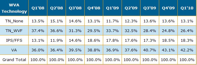 下表則表示了2010年第一季在不同的應用方面各種不同的視角技術的比重。基本上在Notebook 以及LCD Monitor的面板只有相當少的比重采取了高階的IPS或VA的技術,而在LCD TV的部份,VA型的出貨面積高達60%。