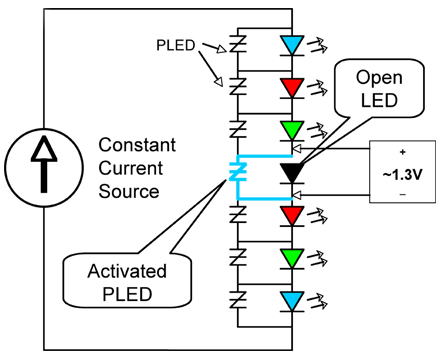 PLED設(shè)計是一種電壓觸髮型電子分路裝置,當(dāng)某個LED出現(xiàn)開路故障時,該裝置能夠提供電流旁路。當(dāng)某個LED故障時,該設(shè)計可避免整個LED燈串都無法正常工作的情況。