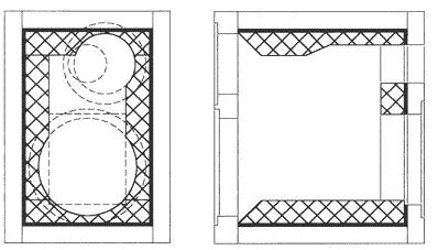 本音箱的箱體制作比較簡單,只需按圖6所示將.6塊具有相應開口的箱板緊固在一起即可,無需使用加強板或支柱。高音單元裝在偏離面板中央的位置和前面板兩側倒成圓角是為了獲得正確輻射方向因而采取的措施。此外,與通常的做法相比,低音反射口不是位于前面板而是位于箱體背后。該反射口內(nèi)接的出聲管可用直徑35mm、長123mm稍具錐度的聚氯乙烯塑料管制成。