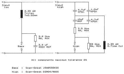 如果允許低音范圍的聲壓級低于100dB,則可使用一只口徑較小的低音單元。在這樣低的聲壓級下通常難以使低頻響應下潛到50Hz以下,但本音箱使用的Scan-Speakl5cm低/中音單元在低頻下卻能產(chǎn)生足夠的聲輸出并能令人滿意地重放2kHz-3kHz的聲音,這樣就不必使用中音單元了。某些口徑較小的低音單元設計成能在較小的音箱中令人非常滿意的重放低音,本音箱使用的低/中音單元就是一個很好的例證。