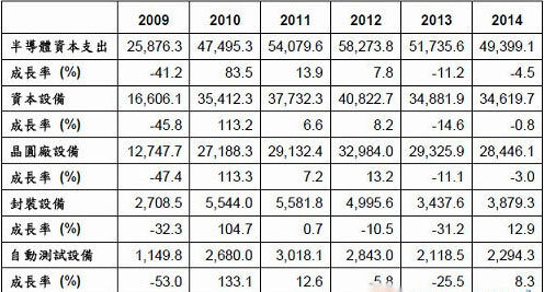 2009~2014年全球半導(dǎo)體資本設(shè)備支出預(yù)估(單位:百萬美元)