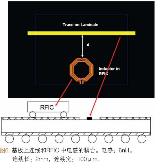 為了對主時鐘線和RF元件之間的相互作用進(jìn)行分析,把壓控振蕩器(VCO)中使用的RF電感(6.0nH)放置在穿通多層襯底的時鐘互連線附近(圖6)。我們在這個研究中使用的互連線長為2.0mm。當(dāng)VCO電感和互連線之間的橫向距離(d)大于0.5mm時,產(chǎn)生的耦合信號將小于-80.0dB。耦合信號的實際要求由SiP系統(tǒng)級電設(shè)計決定。