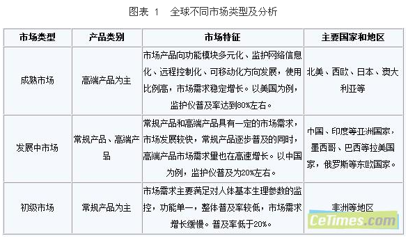 醫(yī)療設(shè)備的發(fā)展與國(guó)家和地區(qū)的經(jīng)濟(jì)發(fā)展水平、醫(yī)療政策以及當(dāng)?shù)鼐用袷杖胨较⑾⑾嚓P(guān),這些因素導(dǎo)致全球醫(yī)療監(jiān)護(hù)儀市場(chǎng)發(fā)展不平。根據(jù)市場(chǎng)特征以及對(duì)產(chǎn)品需求的不同可以將醫(yī)療監(jiān)護(hù)儀市場(chǎng)分為成熟市場(chǎng)、發(fā)展中市場(chǎng)和初級(jí)市場(chǎng)。