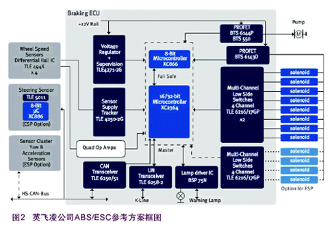 英飛凌在與世界主要ABS/ESC供應商的合作過程中不斷總結經驗,并結合自己全面的產品線,開發出了獨具特色的ABS/ESC參考方案供客戶在此基礎上開發自己的方案。經過日積月累地改進這個方案目前的版本如下圖所示(圖2)。這個方案圖中包括了ABS和ESC兩種方案。整個圖描述的是一個ESC系統,如果去掉方向盤轉角傳感器、橫擺角傳感器和加速度傳感器組以及右下角用來控制四個額外電磁閥線圈的芯片,剩下的器件組成的就是一個ABS系統。