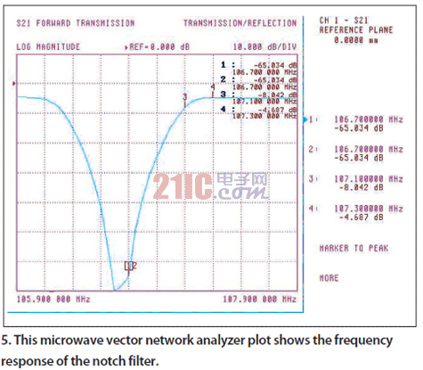 圖4是推薦的解決方案的框圖。該方案使用通用接收測試儀(URT)來復制像上述收音環境的測試條件。微弱信號是在有強大干擾源以及多徑效應等障礙情況下接收到的。第一個發生器(發生器1)提供強大的干擾源。由于這個干擾源的本底噪聲在微弱信號頻率點很高,在將它與第二個發生器(發生器2)產生的微弱信號合并以仿真目標信號之前,需要用一個陷波濾波器抑制這個噪聲。陷波濾波器采用的是一個可以在10MHz范圍內調諧的三極點腔體濾波器,至少具有50dB的抑制能力(圖5)。