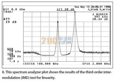 在使用系統之前要對測量裝置進行測試,以便確認測量裝置不會引起任何可能降低測量精度的顯著噪聲或失真。還要通過調整相對的插入值對功率電平進行校準。指定電平在合成器輸出端——收音機天線連接點進行測量。線性度在要求的信號電平之上測量,要做到這一點,必須將兩個發生器在各自頻率處設為CW模式,并且總功率電平要超過測試案例中使用的值。參考圖8,發生器1被設為0dBm,發生器2被設為-20dBm。這里沒有可測量的三階互調(IM3)。圖7描述了被設為接近最大測試條件的信號。