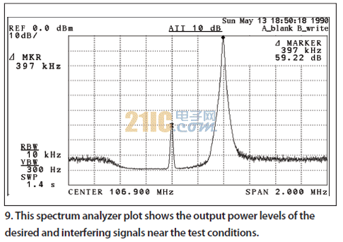 圖8和圖9所示的頻譜分析儀波形證明了功率電平是精確的,并且不存在由于整合兩個信號發生器而引入的IM3。額外的測試表明陷波濾波器確實能有效地抑制來自發生器的噪聲,而隨后在感興趣頻率點的測量受限于熱噪聲,而不是來自測試系統的噪聲。音頻測量是利用URT音頻分析儀在干擾信號中心頻率的不同偏移處于測試接收機的輸出端進行的。這樣,接收機去敏感效應將證明裝置的本底噪聲并不影響測試案例的測量。