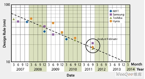 圖1:NAND閃存技術的制造工藝幾何尺寸變化趨勢。