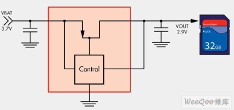 對于低速工作的小容量SD卡,耗電量常常小于100mA。假設鋰離子電池的額定工作電壓為3.7V,且存儲器的電源軌相當高,則線性調(diào)節(jié)器就成為SD存儲器的電源選擇。不過,選定的線性調(diào)節(jié)器必須能以低壓降(LDO)方式工作,因為鋰離子電池的有效電壓范圍在3.2至4.2V之間。