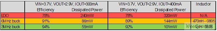 表1:LDO與6MHz降壓轉換器和3MHz降壓轉換器的電源效率與功耗對比。