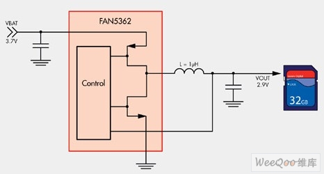 圖4:FAN5362降壓轉換器實現(xiàn)2.9VSD卡的供電電路。