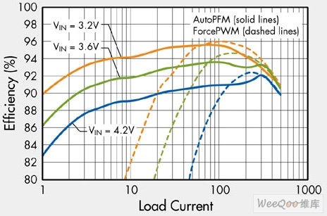 按照表1的計算,對于300mA的系統(tǒng),F(xiàn)AN5362能把功耗降至55mW;對于400mA的系統(tǒng),F(xiàn)AN5362能將功耗降至101mW。這些效率值根據(jù)所測得的FAN5362效率曲線而獲得。圖5顯示了AutoPFM(實線)和ForcePWM(虛線)的效率曲線。在優(yōu)化FAN5362效率的同時,選擇3MHz作為額定開關頻率,因為它能夠提供尺寸和效率之間的最佳權衡。從表1可看出,對于這種功耗敏感應用,采用6MHz開關頻率時的功耗遠遠大于采用3MHz開關頻率時的功耗。